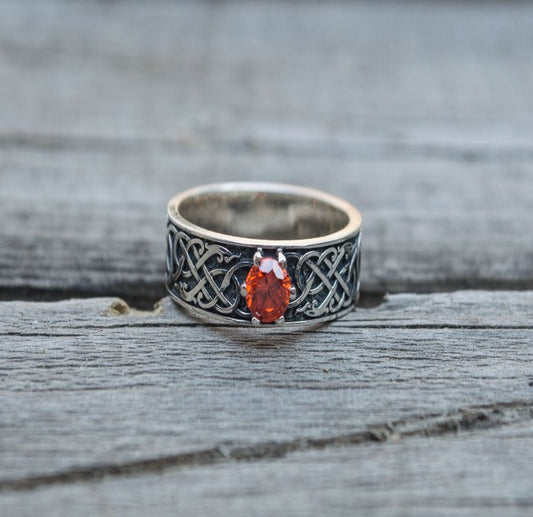 Norse Ornament Ring with CZ Sterling Silver Handmade Viking Jewelry