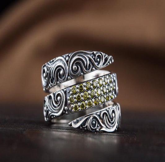 Norse Ornament Ring with Green Cubic Zirconia Sterling Silver Handmade Jewelry