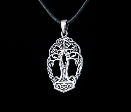 Yggdrasil with Mjolnir Pendant Handmade Sterling Silver Viking Necklace