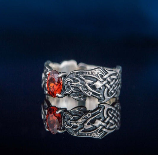 Viking Ring with CZ and Norse Ornament Sterling Silver Viking Jewelry