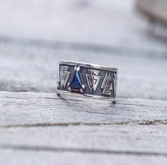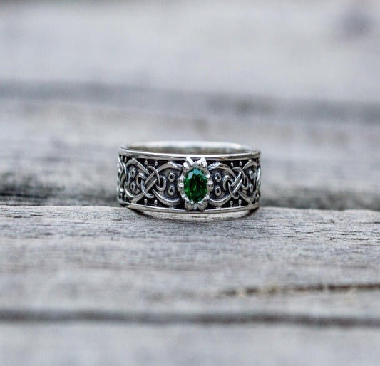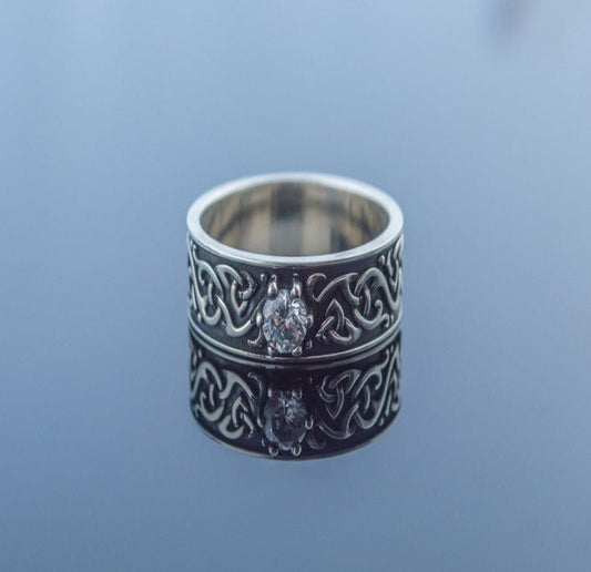 Viking Ring with Scandinavian Ornament and Cubic Zirconia Sterling Silver Unique Jewelry