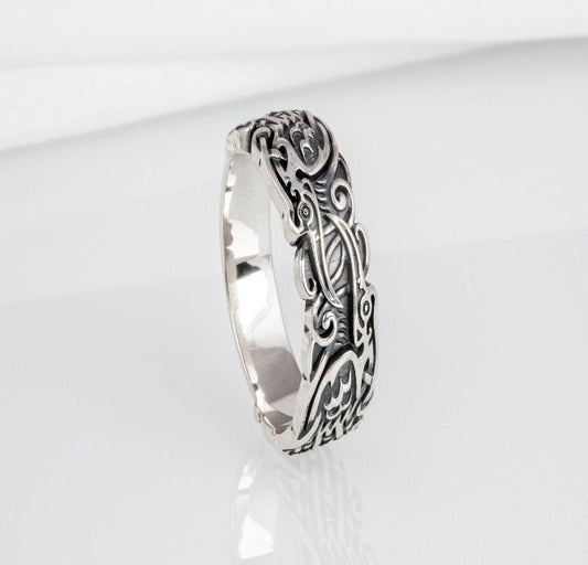 Sterling silver Viking ring with Ravens and unique ornament, handcrafted ancient style jewelry