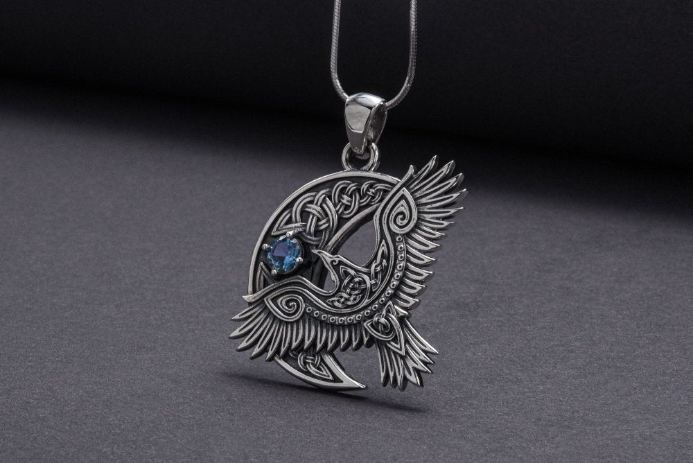 Unique 925 Silver Raven Pendant With Gem, Handmade Jewelry